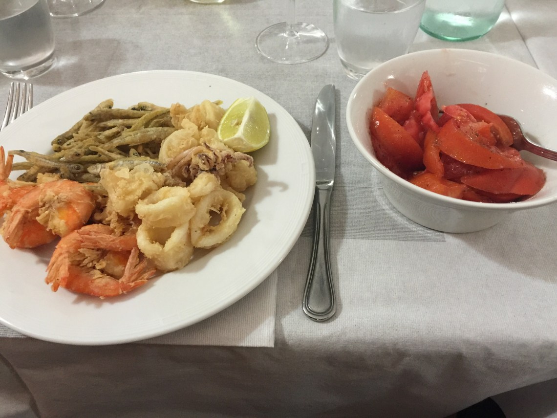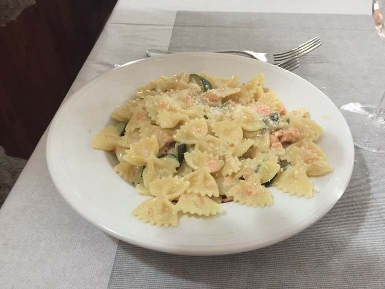 Everything stops for lunch of a ‘fritto misto’: a plate of fried seafood, prawns, small squid and whitebait. Had a tomato salad as a healthy touch. Jamie got stuck into a plate of ‘farfalle’ butterfly-shaped pasta with a courgette, salmon and cream sauce. Shared a Crema Catalana, which is a creme brulee. Surprised we could do anything after that and a glass of white. But Serenella’s was full as usual, with builders, including our plumber and local police officers so it’s obviously what you do.