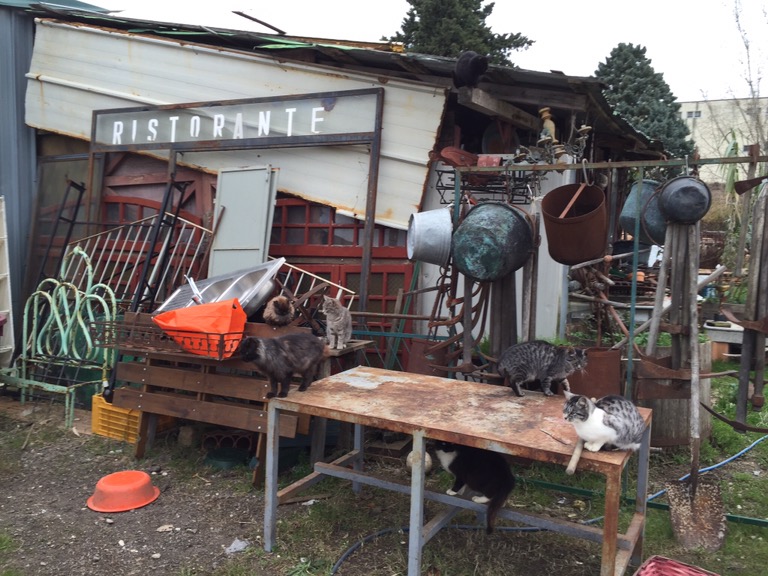 This morning we drove to a nearby town where, we were reliably informed, could be found a reclaimation yard. We arrived at a ramshackle group of buildings and a house whose garden was filled with terracota flowerpots of every size imaginable. This is the realm of Mauro and is called “Il Corte del Tarlo” which translates as “The Woodworm Court”. Apart from Mauro we were also welcomed by the wonderful Gina (14 year old Alsatian), Camilla (a tame sheep) and about a dozen beautiful, but shy cats. What an incredible place, stuffed full of enormous wardrobes, sideboards and corner cupboards the size of small sheds. No-one has room for these anymore and they languish in the open sheds and leaky-roofed outbuildings like sad echoes of more elegant times, damask curtains and silver service.