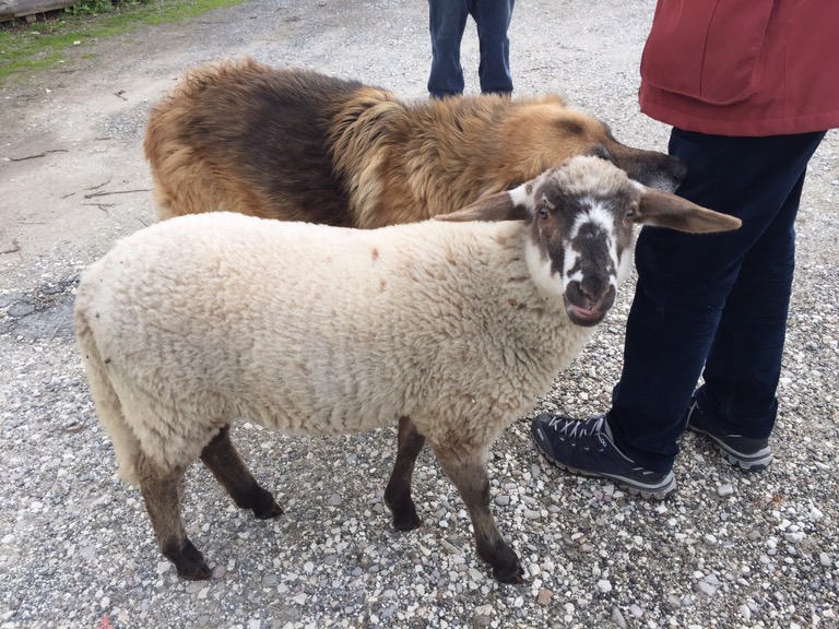 When Paola says “tame sheep,” that doesn’t begin to cover it. She came rushing up to greet us, shoving the Alsatian out of the way, and then followed us around as we explored the sheds and barns.