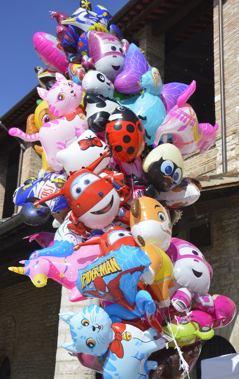 This is about an hour and a half from us on the other side of Perugia. The countryside is quite different and we could see the snow-capped mountains of the Apennines. The town clings to the side of mountain and the streets are steep and winding. There is a funicular railway that will take visitors to the top of the town, where the castle and basilica probably offer the most fantastic views of the surrounding countryside. The funicular is a series of open cages, just large enough for two, that sweep upwards and you have to jump off, rather like ski lifts. We decided to save this thrilling adventure for our next visit as we had Daisy with us and I had visions of her refusing to get off or being dragged skywards all alone in a cage……