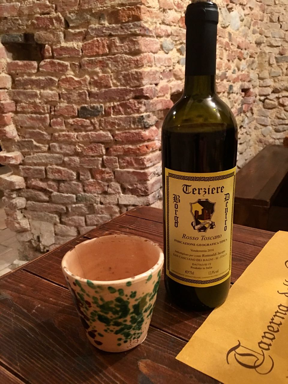 Our section (terziere) called Borgo Dentro, which means ‘Town Centre’, has a wonderful clubhouse/taverna inside an old palazzo. Access is down a flight of steps and into a series of enormous cavernous rooms with vaulted ceilings. Each section has such a clubhouse and all appear to also have incredibly well equipped stainless steel kitchens to supply the hundreds of meals that feed the town during its celebrations. Service is always prompt, efficient, the food hot and tasty and great value. Even the wine is produced for and probably by, local producers with affiliations to each section. First course choice was the tagliatelle with venison ragu and then the flame grilled chicken with spinach and Jamie had grilled sausages with beans and oven roasted potatoes. Instead of dessert we shared a glass of sweet vin santo with dunking biscuits.